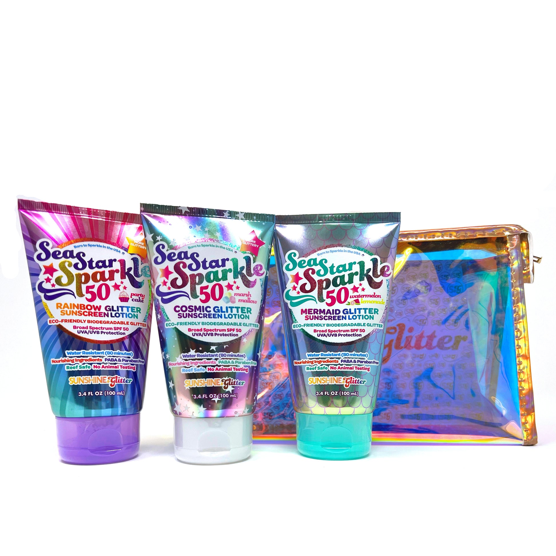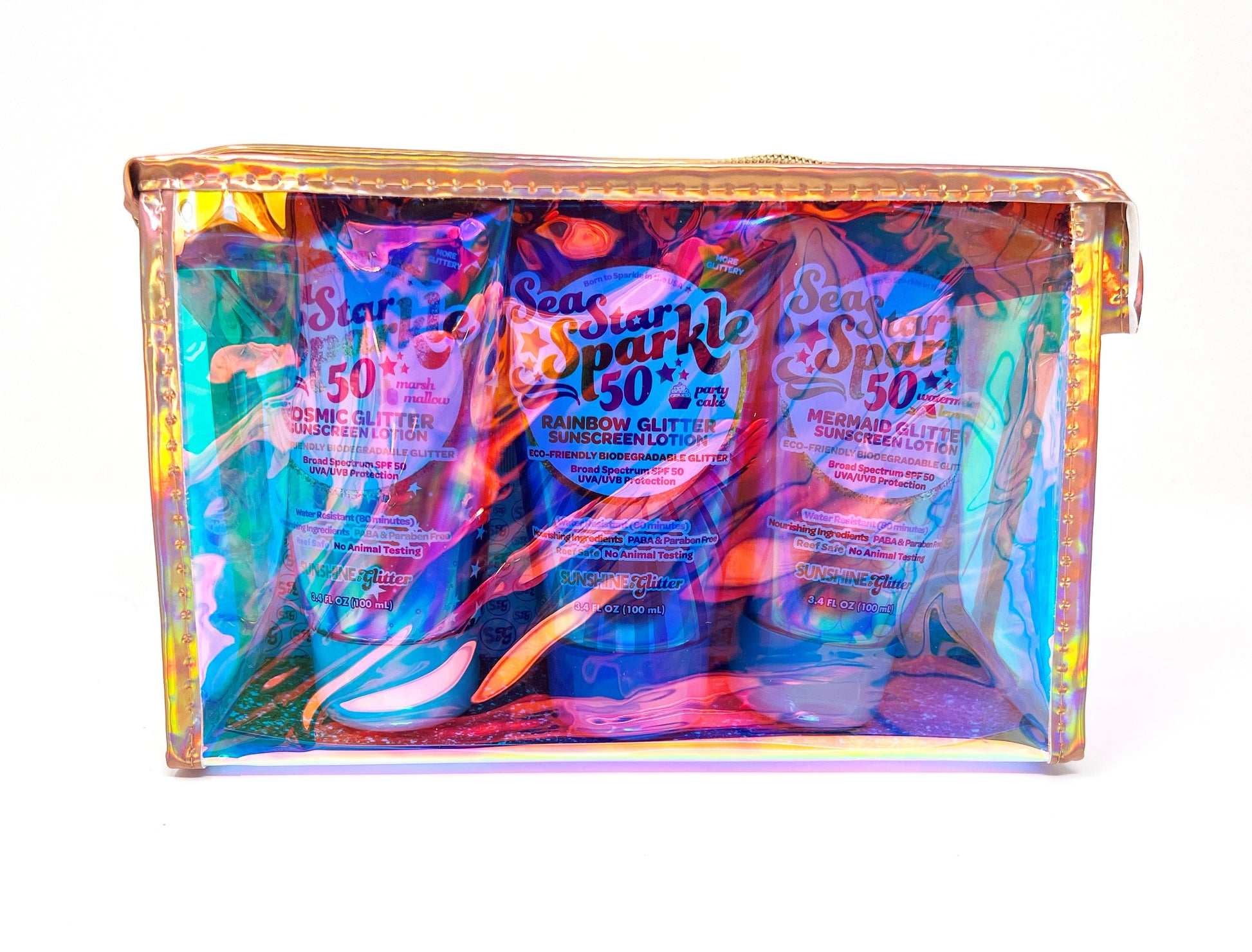 Includes a holographic rose gold zippered cosmetic bag and all three of our fabulous 80 minute water resistant biodegradable glitter SPF 50 sunscreens: